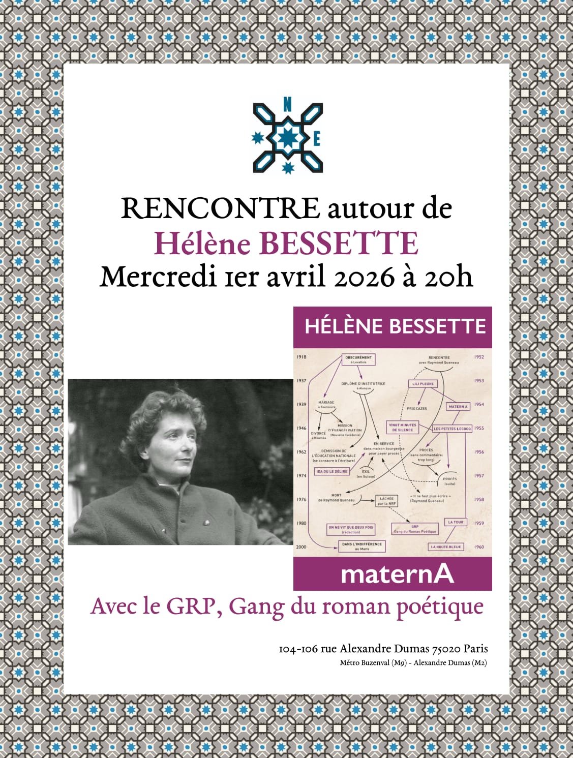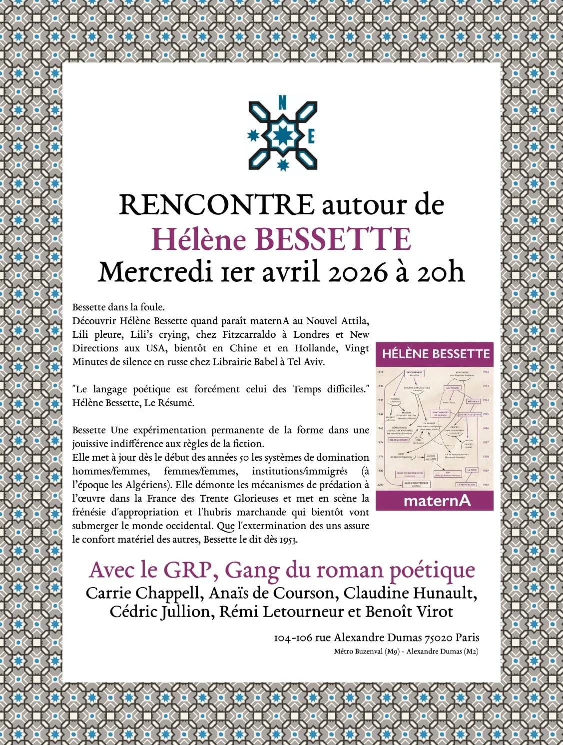 Mercredi prochain le 1 avril 2026, à 20h le Gang du roman poétique (le GRP) — Anaïs de Courson, Claudine Hunault, Cédric Jullion, Rémi Letourneur, Benoît Virot et moi-même — sera à la Libraire Le Nouvel Équipage pour parler de l’œuvre d’Hélène Bessette, propice comme toujours, à l’heure où le sentiment fasciste progresse en Europe et ailleurs. En compagnie de la nouvelle réédtion de maternA, roman sans paysage et sans homme. J’espère vous y voir nombreuses et nombreux.